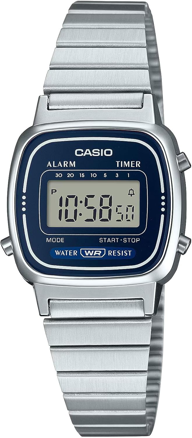 O relógio feminino Casio prata, modelo LA670WA-2AD, destaca-se por sua praticidade e estilo refinado. Com resistência à água para uso leve, suas dimensões compactas proporcionam um ajuste confortável no pulso, complementado pela leveza de apenas 26 gramas. Fabricado com materiais de alta qualidade, como vidro de resina e caixa de resina cromada, oferece durabilidade e elegância. Seu mecanismo digital, alimentado por uma bateria CR1216 com duração aproximada de 2 anos, apresenta uma série de funções especiais, como cronômetro, temporizador e alarme diário. Além disso, possui calendário automático e precisão de ±30 segundos por mês. Com mostrador azul e caixa e pulseira prateadas, este relógio combina versatilidade e estilo em um único acessório. A garantia de 1 ano em todo o território nacional proporciona confiança e tranquilidade ao usuário.