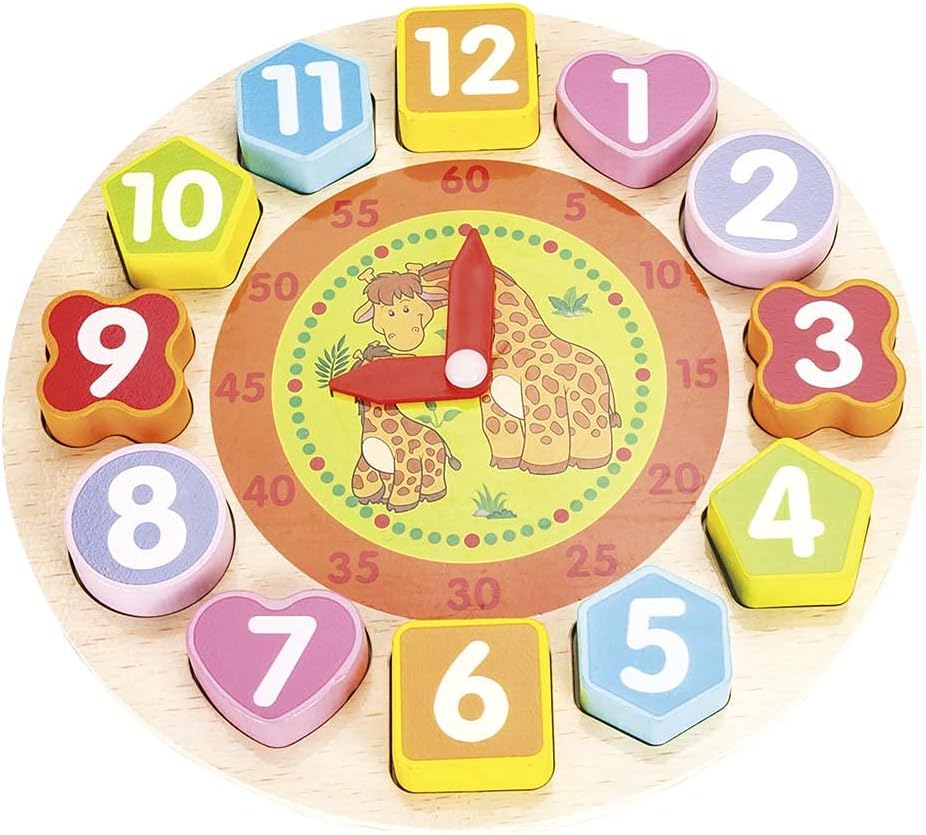 Relógio didático em madeira com números coloridos para encaixe. Estimula a coordenação motora, concentração e o aprendizado de cores, formas, números e hora. Sortido em várias ilustrações de fundo.